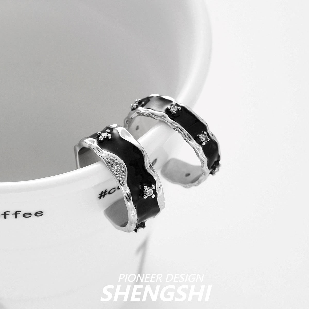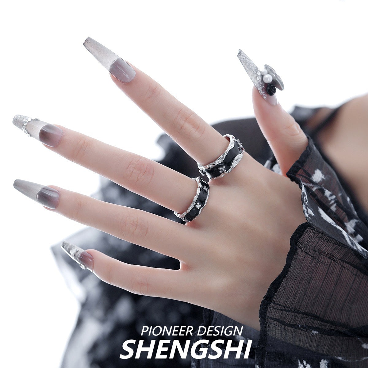 A niche black, irregularly shaped diamond-studded, adjustable, cool-style, luxury ring for women. Size: Adjustable opening